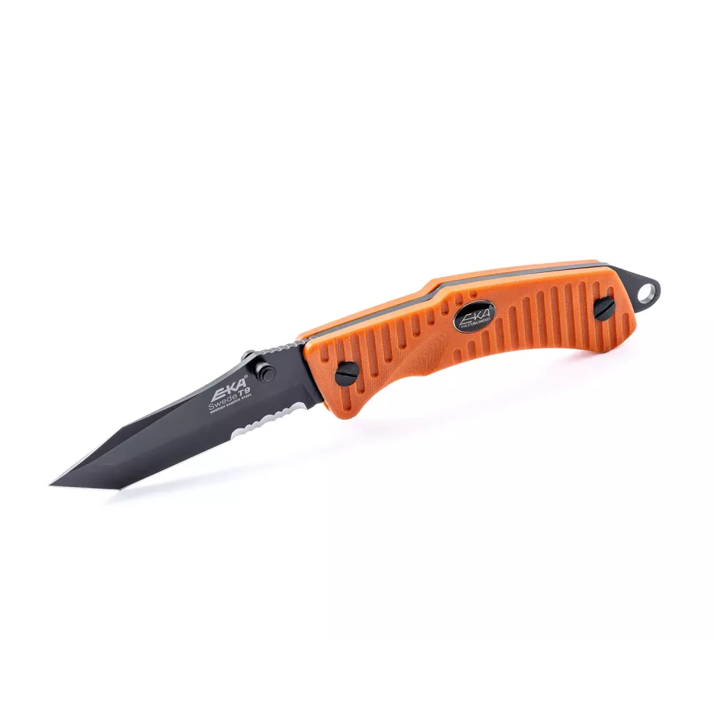 EKA Swede T9 Orange - a tactical folding knife with patented rear lock, Tanto design and pocket clip.