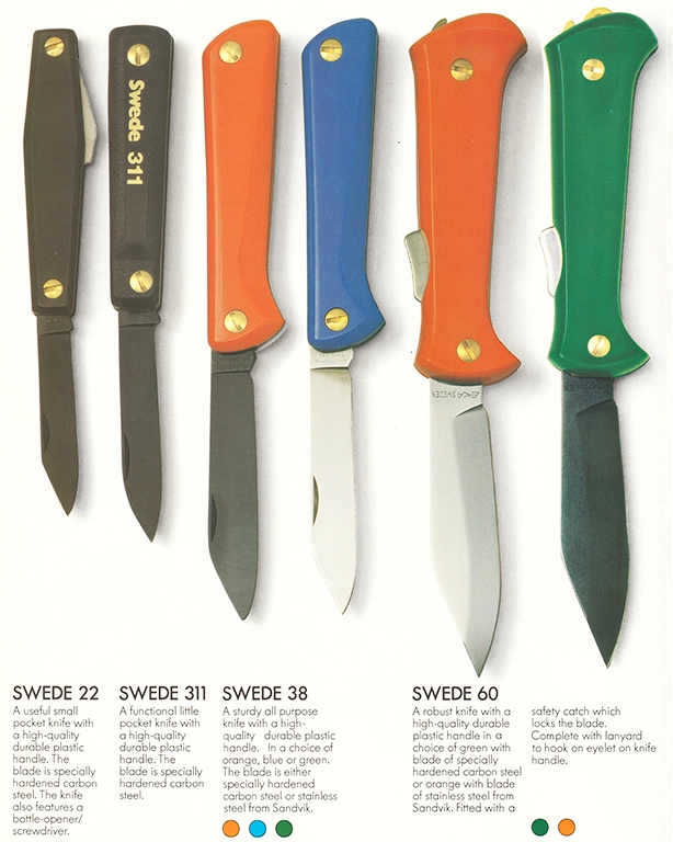 The Swede 38 model was designed by Sigvard Bernadotte. It featured an 8 cm blade made of stainless steel or black-oxidized carbon steel, with a handle made of impact-resistant ABS plastic. It could also be delivered in a luxury package with a sharpening stone.