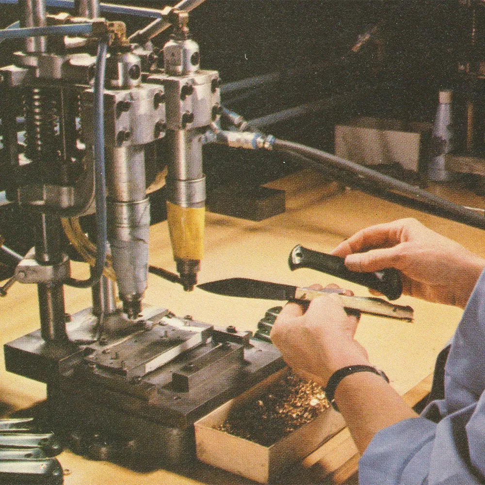 Evrell set out to create the world’s best folding knife with a single blade. After years of experimentation, he introduced a groundbreaking innovation that would revolutionize knife manufacturing globally. Before 1970, when this innovation was presented, all knives were riveted, either by hand or with riveting machines, and it took up to four years for a knife maker to master the required skills.