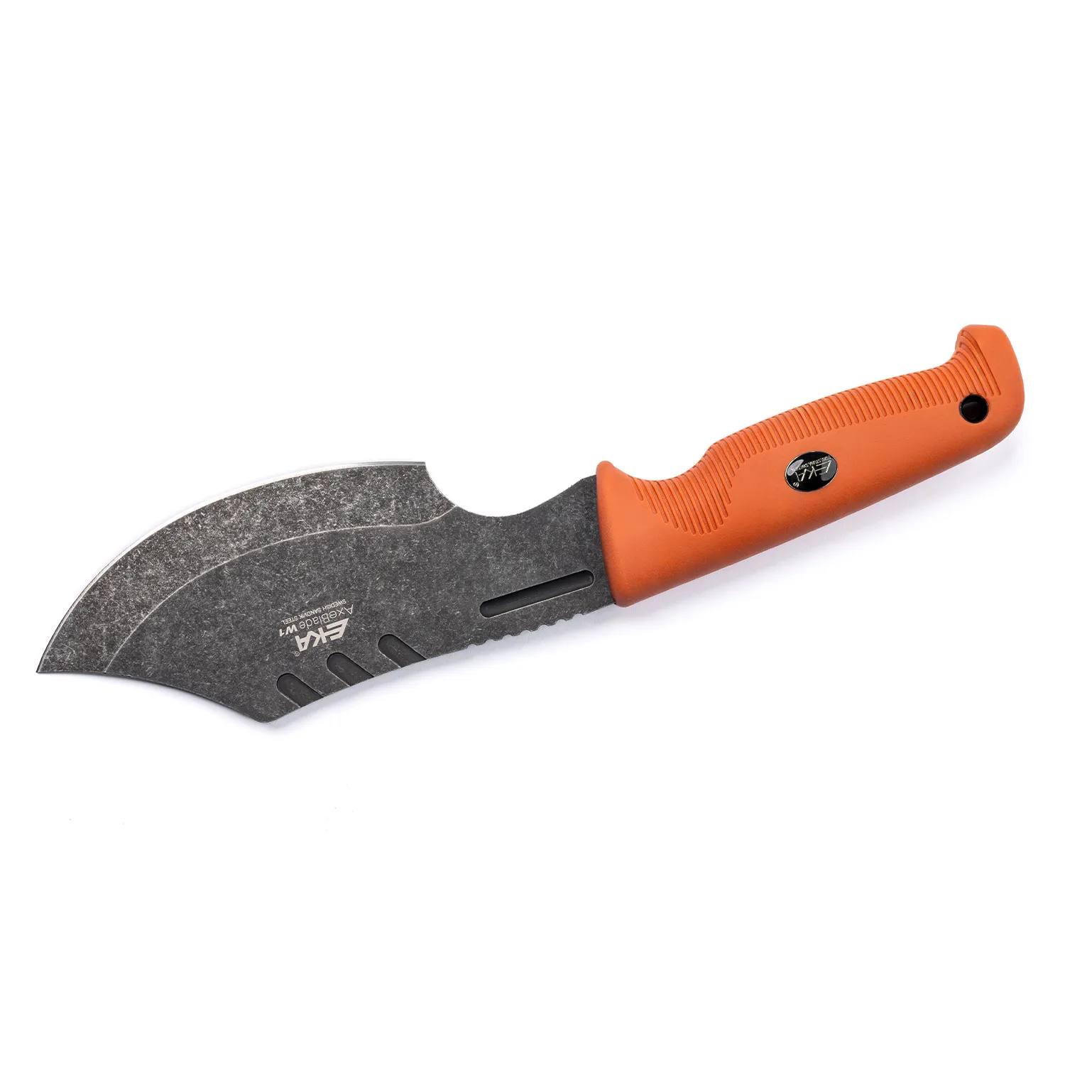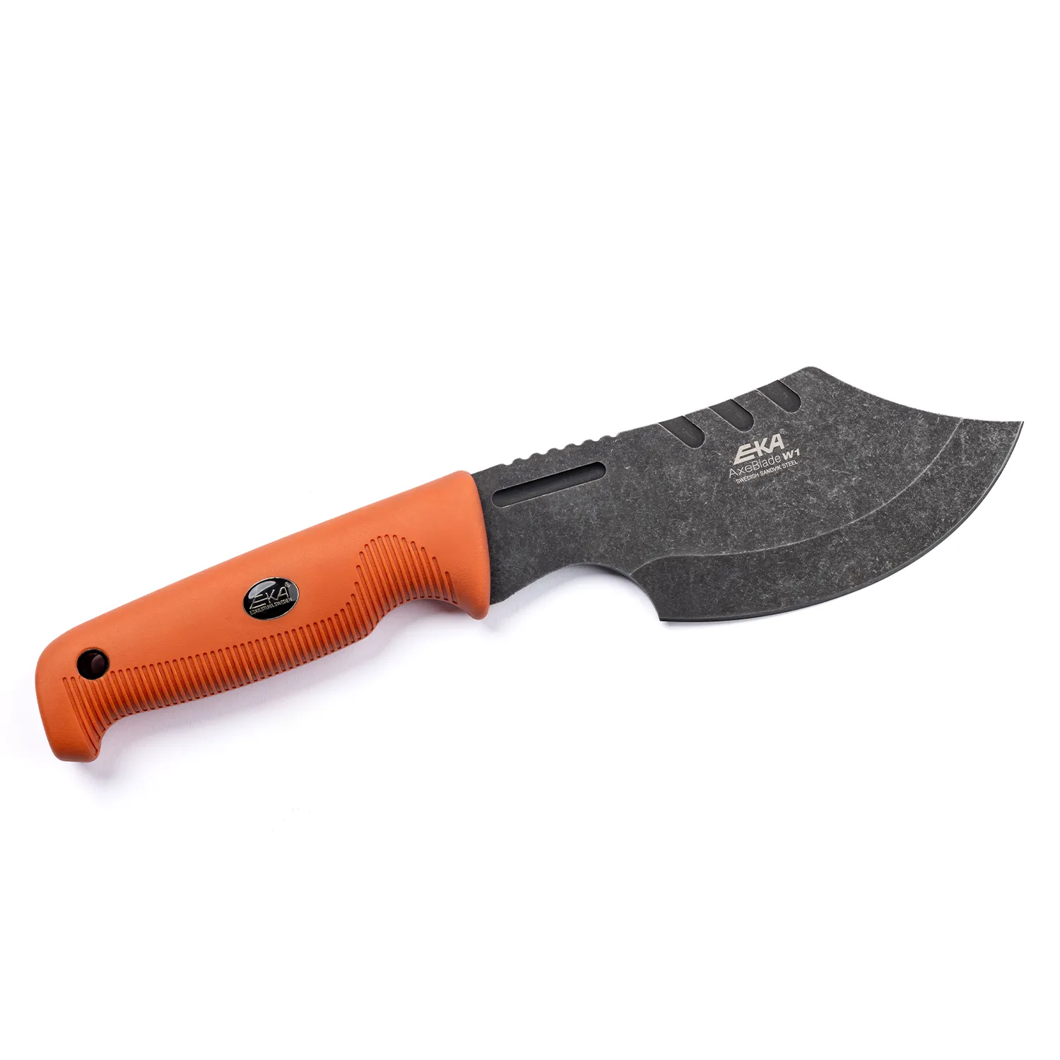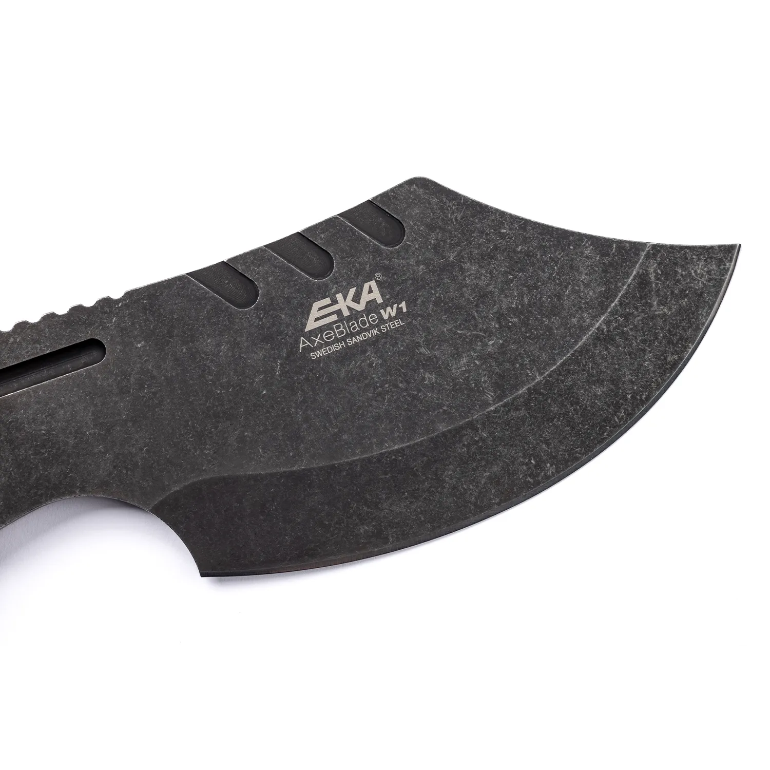 The EKA® AxeBlade W1 is an all-around multipurpose cutting tool. Great for the avid outdoorsman who might encounter just about anything. It boasts an impressive sweeping convex blade design. The AxeBlade W1 has jimping along the spine as well as recessed curvature to allow for closer controlled grip when doing fine tasks. So the AxeBlades could be used as a light chopper if need be as well as effective useful tool to make a tent stake, make shavings to start a fire and much more.