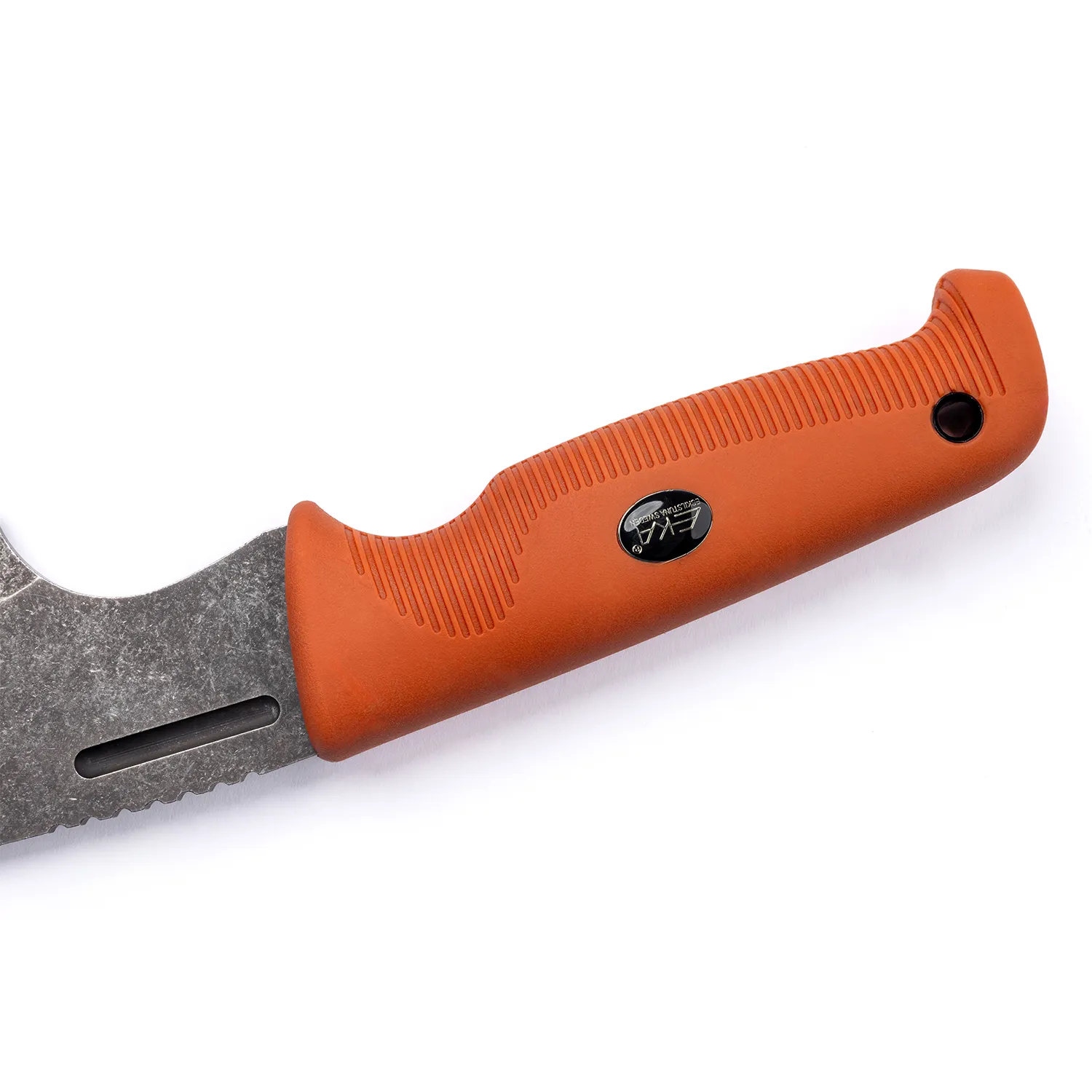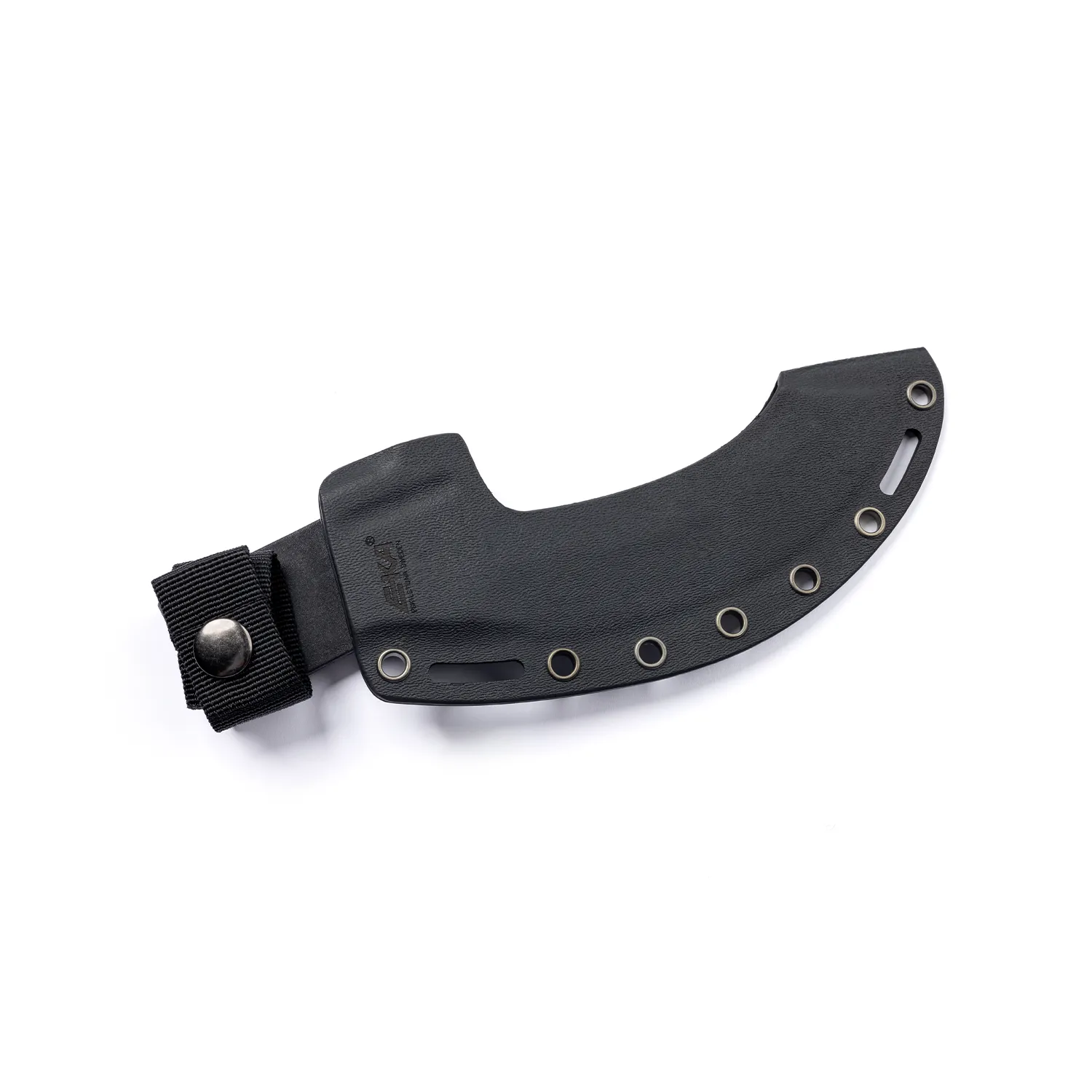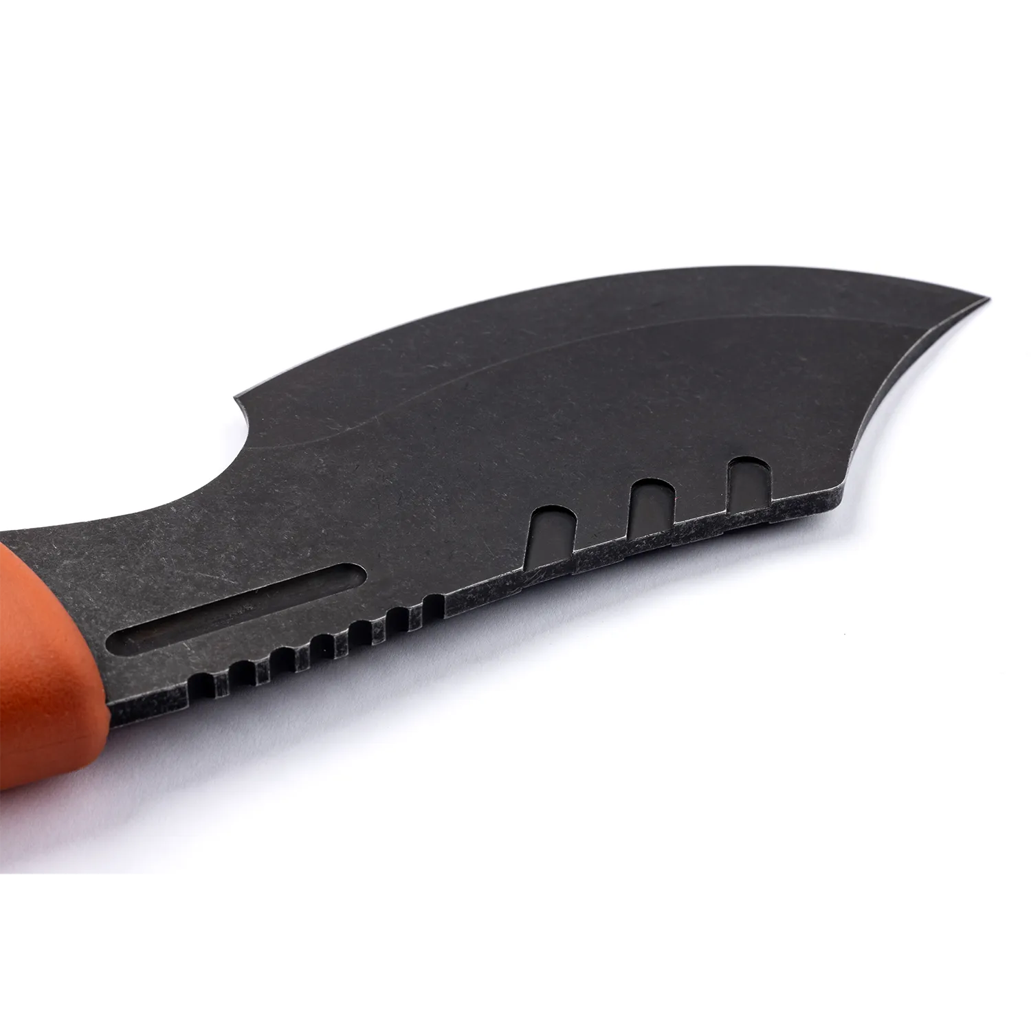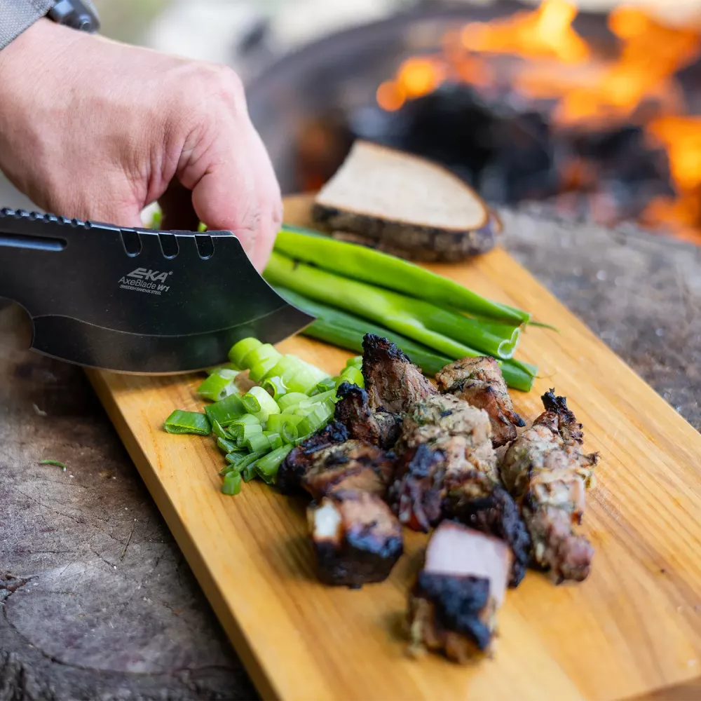 The EKA® AxeBlade W1 is an all-around multipurpose cutting tool. Great for the avid outdoorsman who might encounter just about anything. It boasts an impressive sweeping convex blade design. The AxeBlade W1 has jimping along the spine as well as recessed curvature to allow for closer controlled grip when doing fine tasks. So the AxeBlades could be used as a light chopper if need be as well as effective useful tool to make a tent stake, make shavings to start a fire and much more.