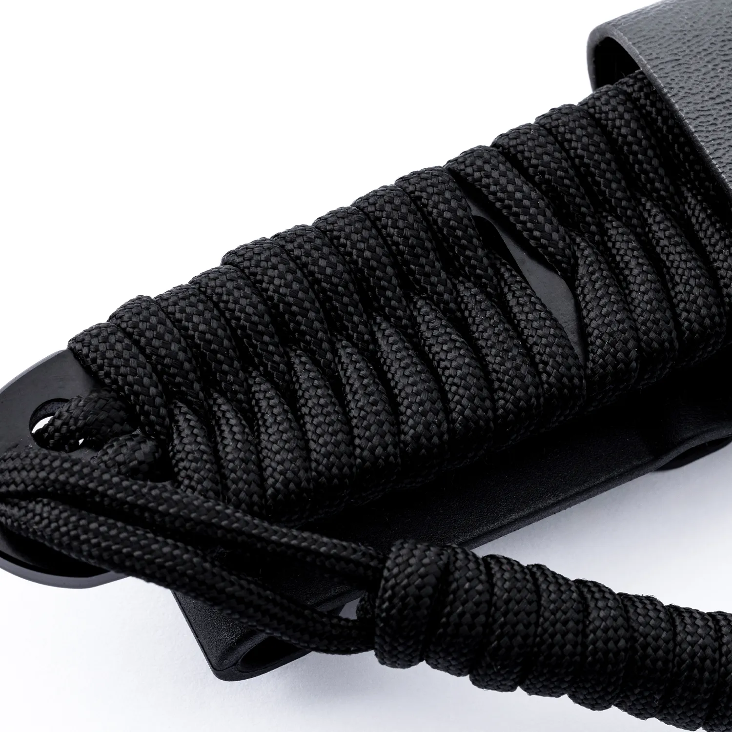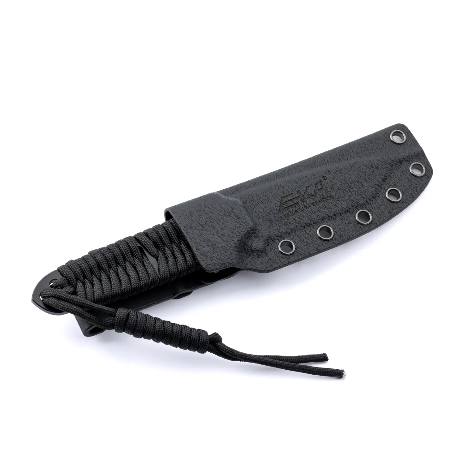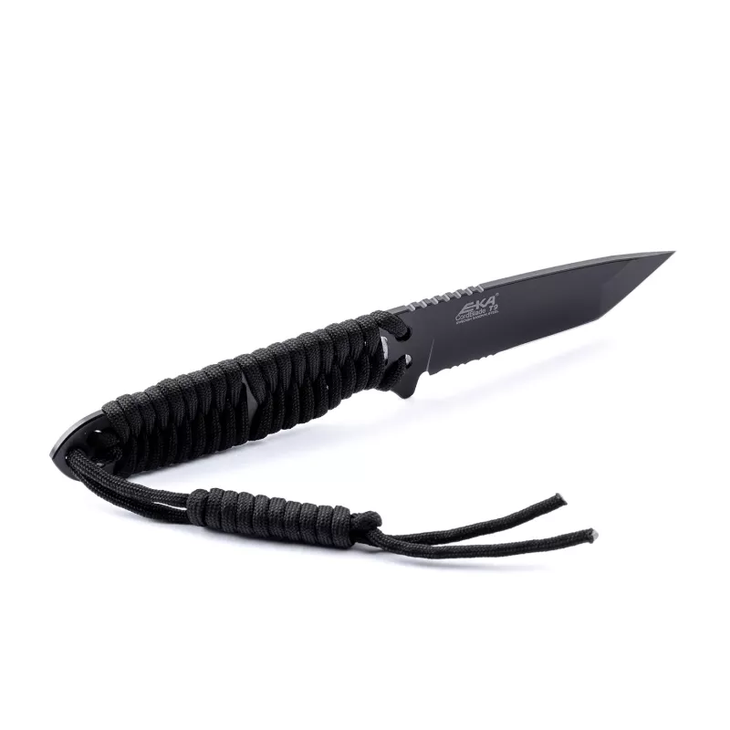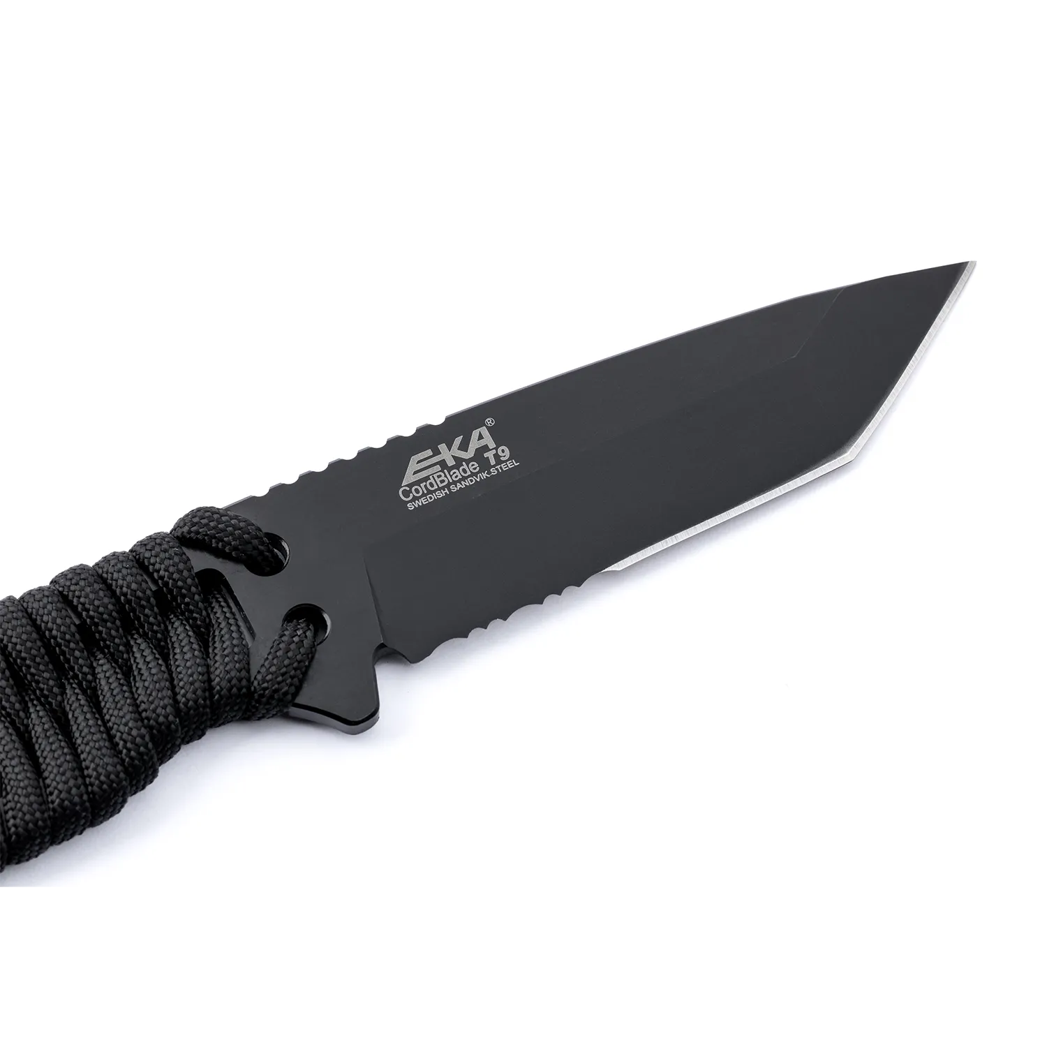EKA® CordBlade T9 Black was built for just about anything survival, security, military and rescue. A knife with a pointed blade and full tang construction, makes it ideal for heavy duty use. A textured thumb grip on blade back for better control. The CordBlade T9 was conceived from our very popular Nordic T12 fixed blade knife. Instead of G10 scales the CordBlade T9 comes with a black Paracord wrapped handle and a kydex belt sheath that you can attach to a pack, a vest or just about wherever you need.