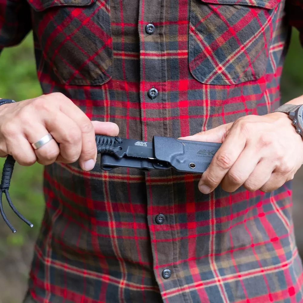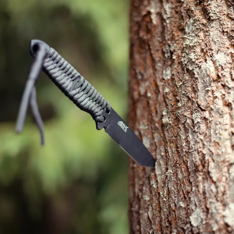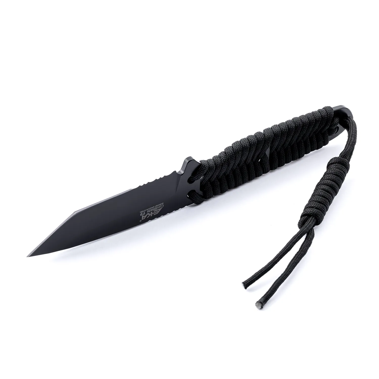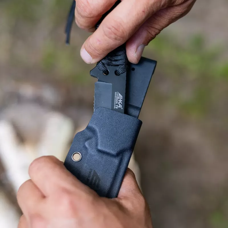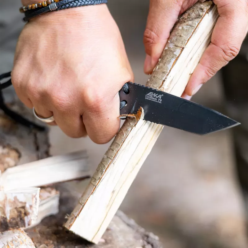 EKA® CordBlade T9 Black was built for just about anything survival, security, military and rescue. A knife with a pointed blade and full tang construction, makes it ideal for heavy duty use. A textured thumb grip on blade back for better control. The CordBlade T9 was conceived from our very popular Nordic T12 fixed blade knife. Instead of G10 scales the CordBlade T9 comes with a black Paracord wrapped handle and a kydex belt sheath that you can attach to a pack, a vest or just about wherever you need.