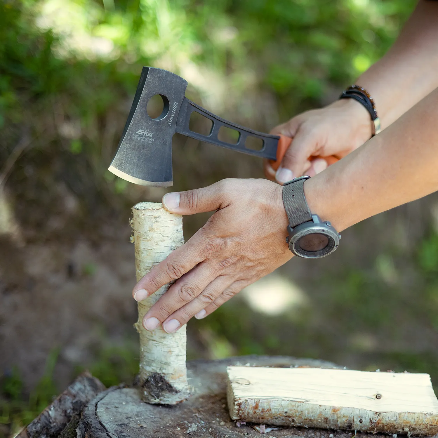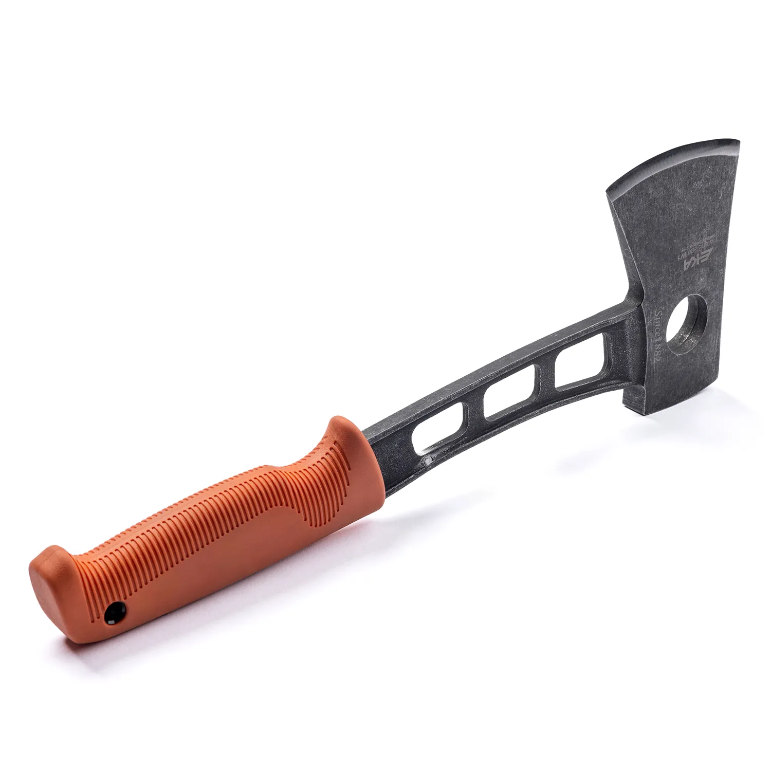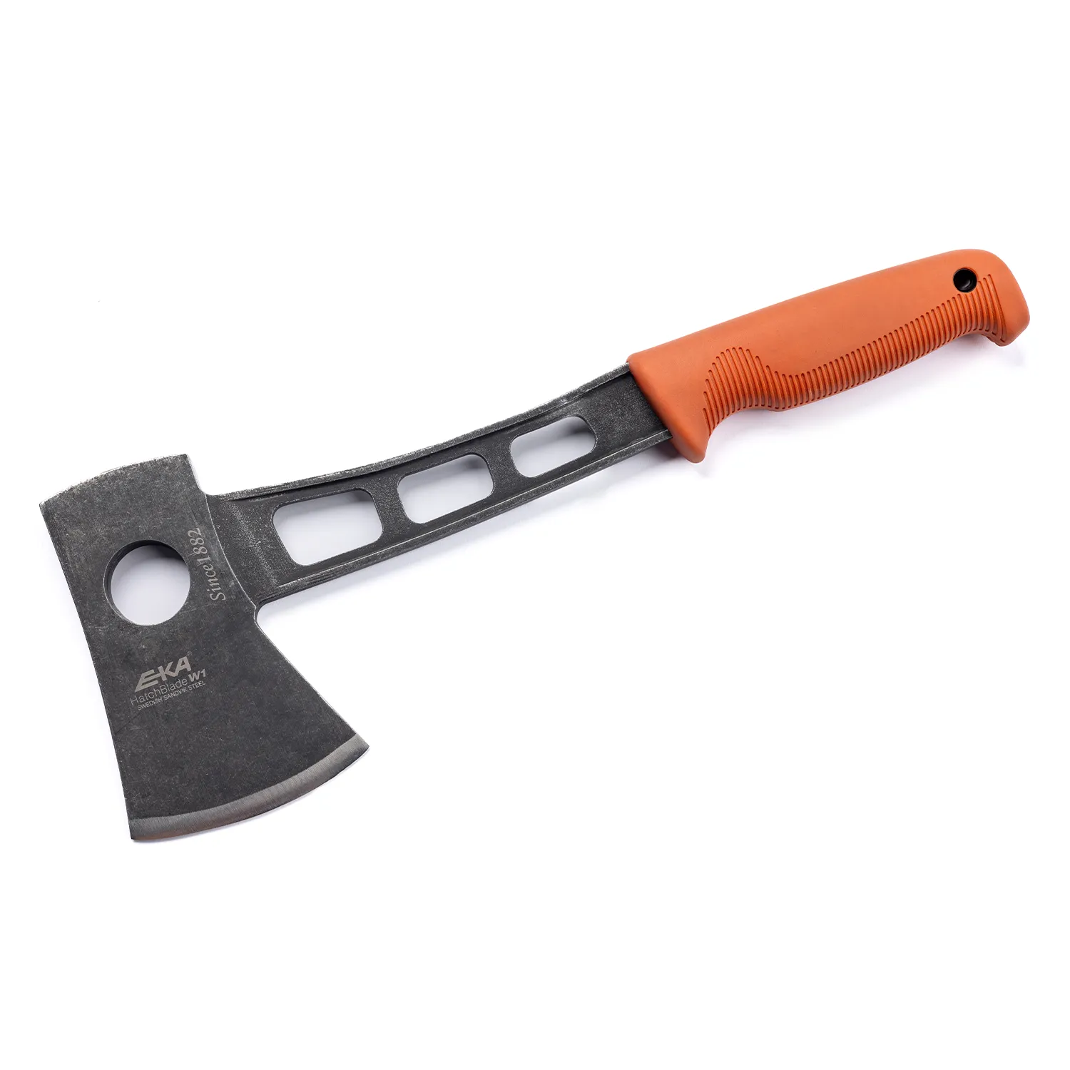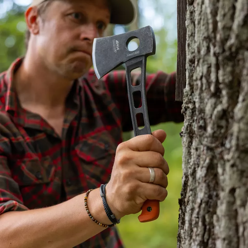 The HatchBlade W1 Orange by EKA® is the perfect compact sized all around hatchet. Measuring in at 12.6 inches it is easy to pack and carry with you pretty much anywhere for any situation. It has a nice ergonomically formed handle that feels comfortable in the hand and helps the user to achieve maximum power and impact when splitting or cutting wood. There is also a 1-inch diameter opening in the head that would allow the user to place a finger through for greater control and grip when using for small finer task such as making a tent stake, tinder, a feather stick or even for food preparation. The HatchBlade W1 comes with a Kydex sheath that has a Belt Clip as well as 11 lashing points so it can be attached to just about anything.
