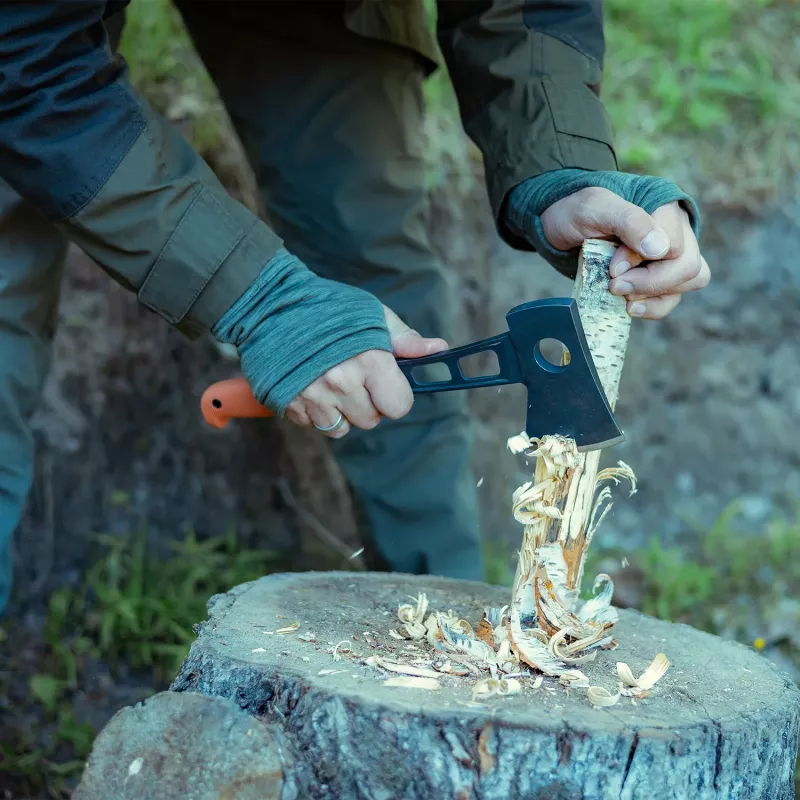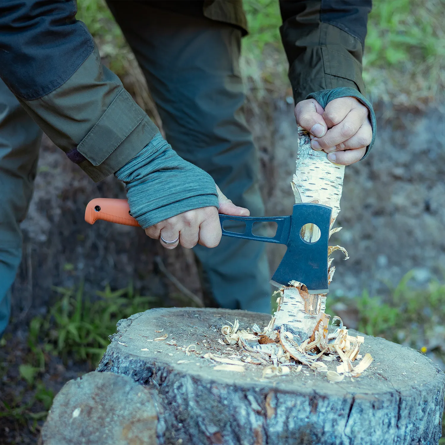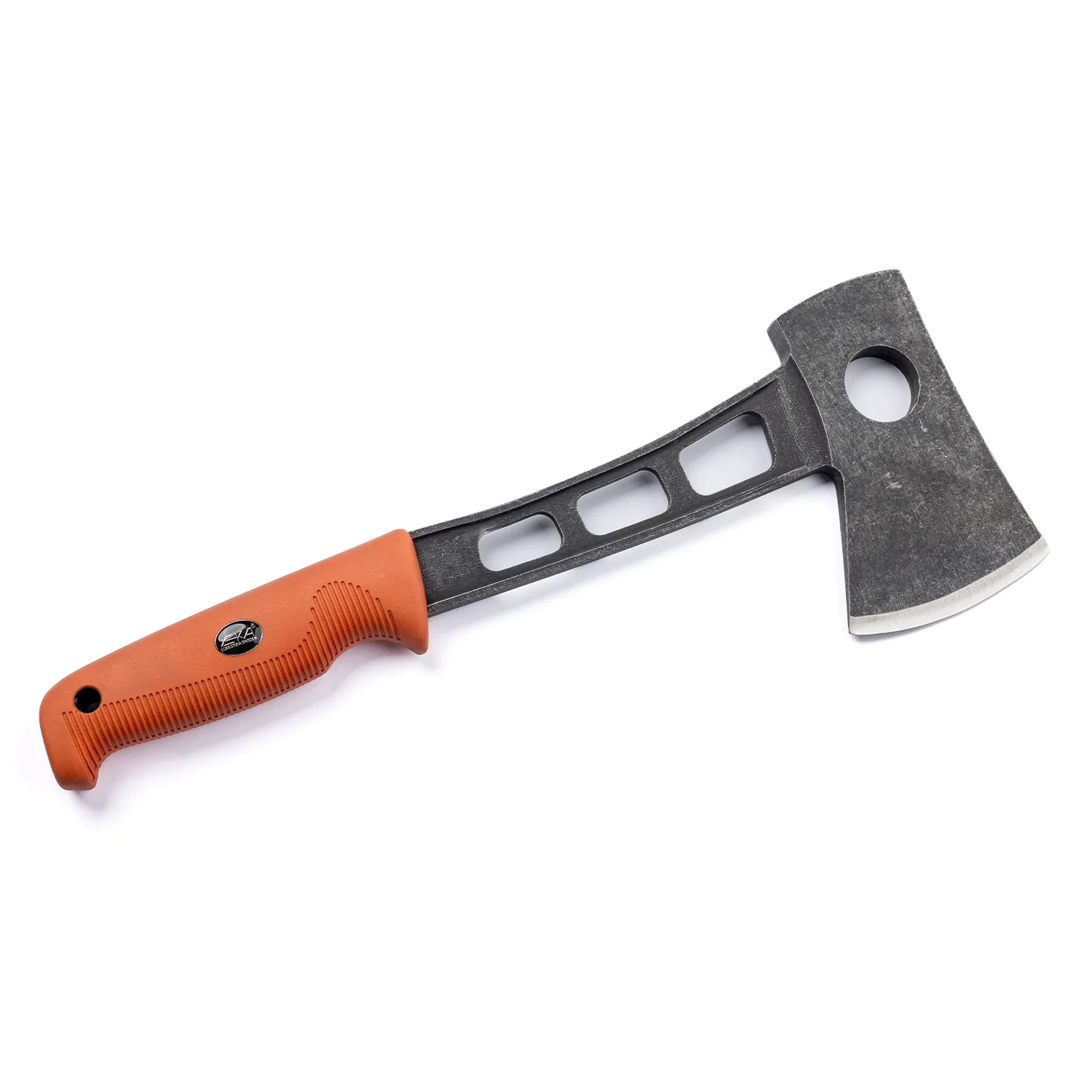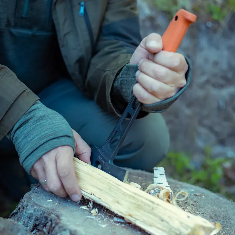 The HatchBlade W1 Orange by EKA® is the perfect compact sized all around hatchet. Measuring in at 12.6 inches it is easy to pack and carry with you pretty much anywhere for any situation. It has a nice ergonomically formed handle that feels comfortable in the hand and helps the user to achieve maximum power and impact when splitting or cutting wood. There is also a 1-inch diameter opening in the head that would allow the user to place a finger through for greater control and grip when using for small finer task such as making a tent stake, tinder, a feather stick or even for food preparation. The HatchBlade W1 comes with a Kydex sheath that has a Belt Clip as well as 11 lashing points so it can be attached to just about anything.