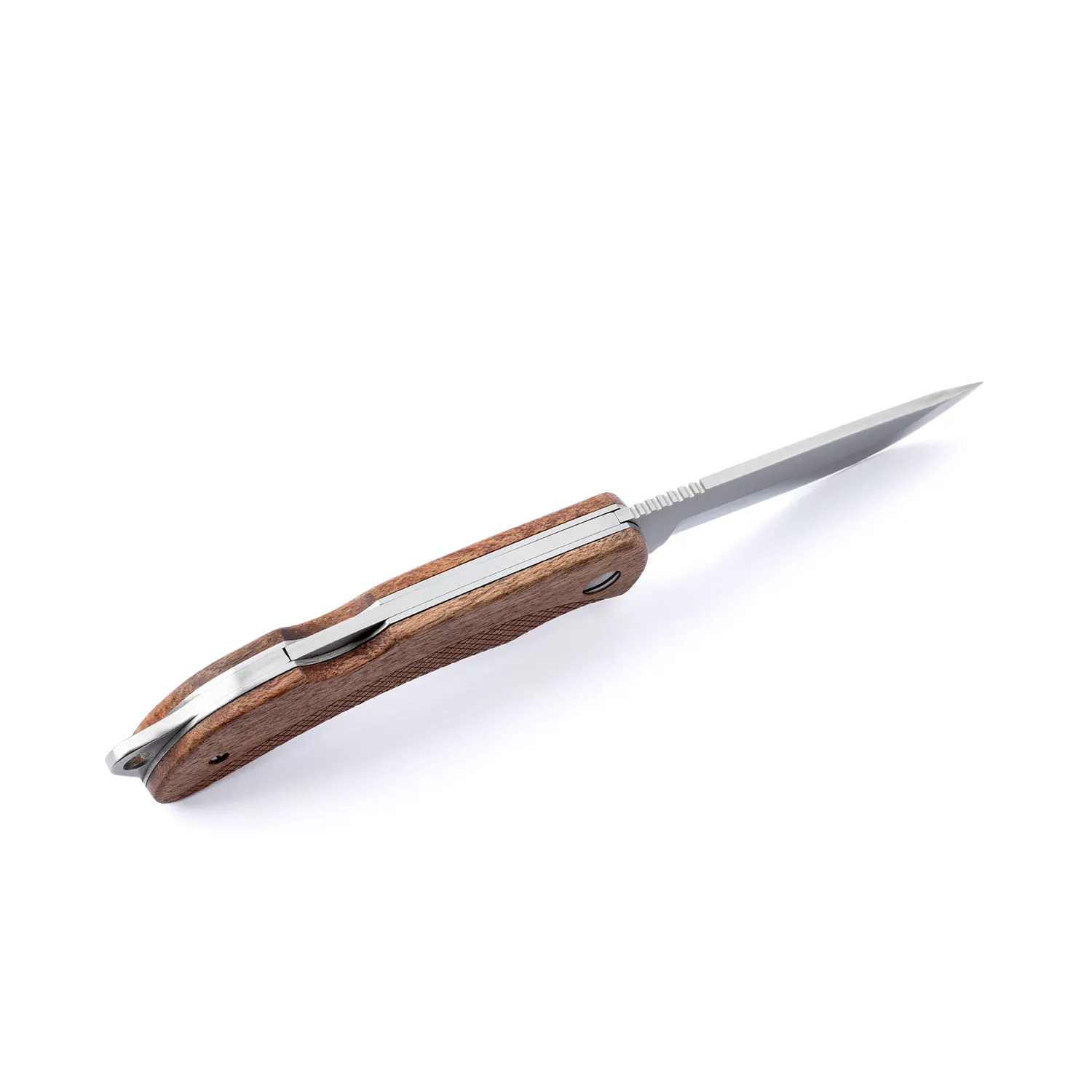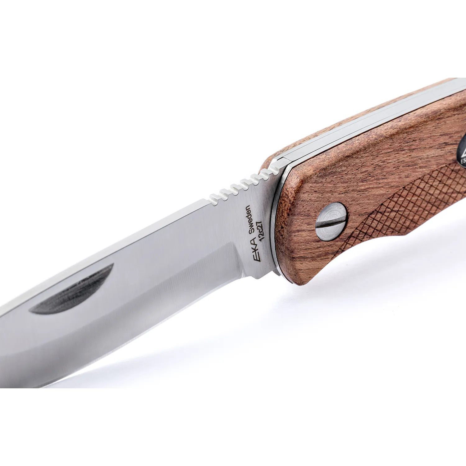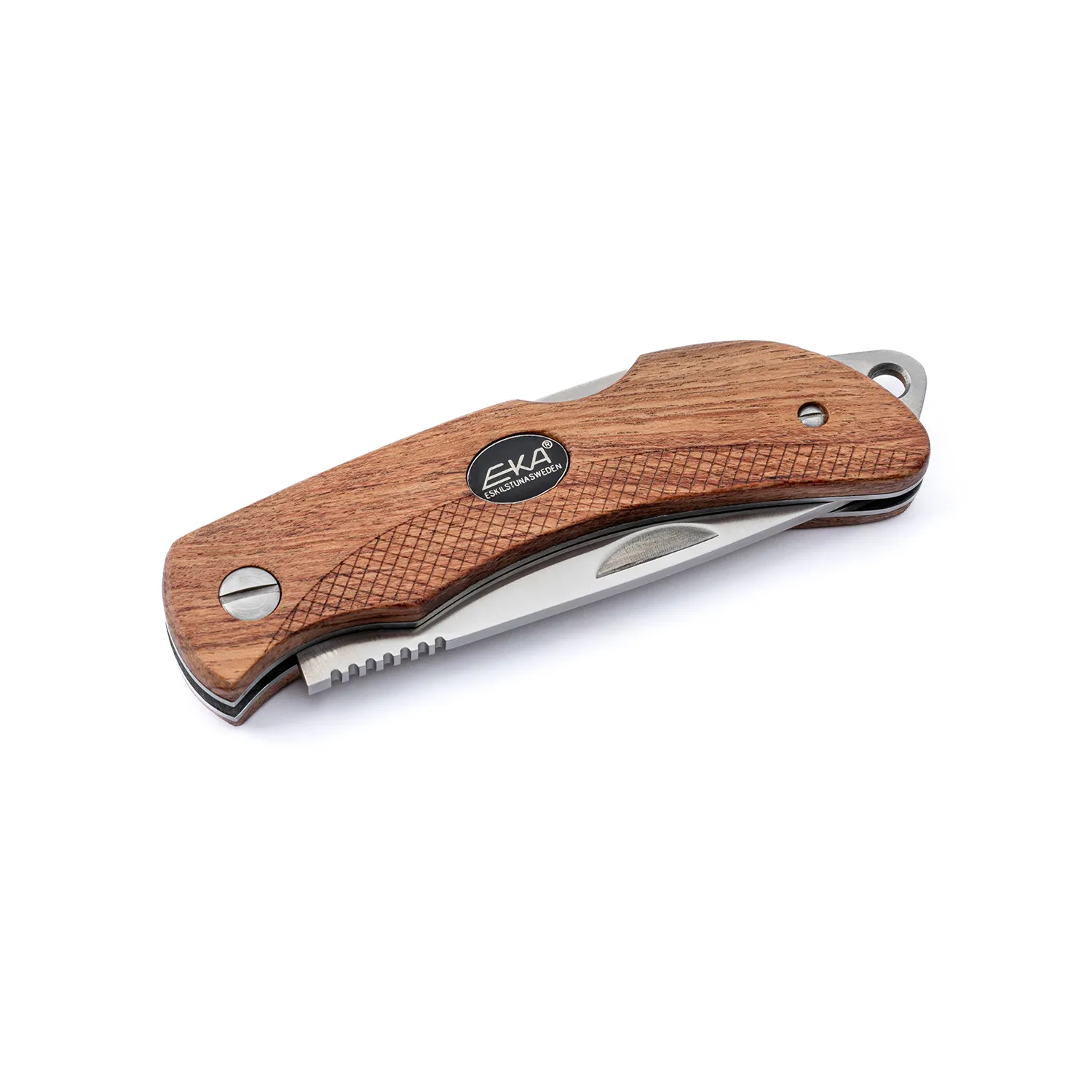 No matter your profession or hobby the folding knife Swede 8 Wood by EKA1882 will fill your needs. With its sturdy drop point blade and secure locking mechanism, the uses are endless. The handle material is made by elegant dark wood to release stressed conditions and to feel for the gentleman's touch. Included is a black leather sheath with a belt clip.