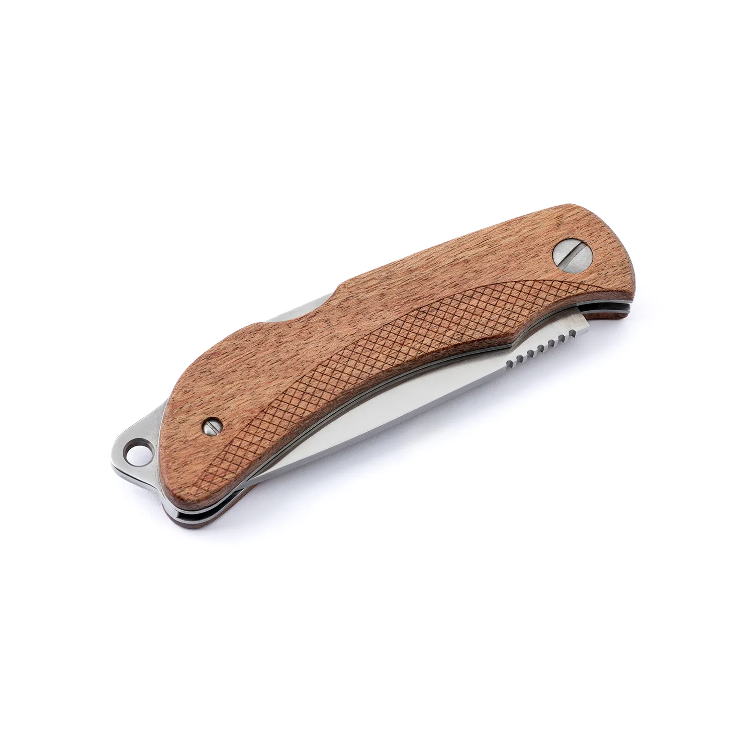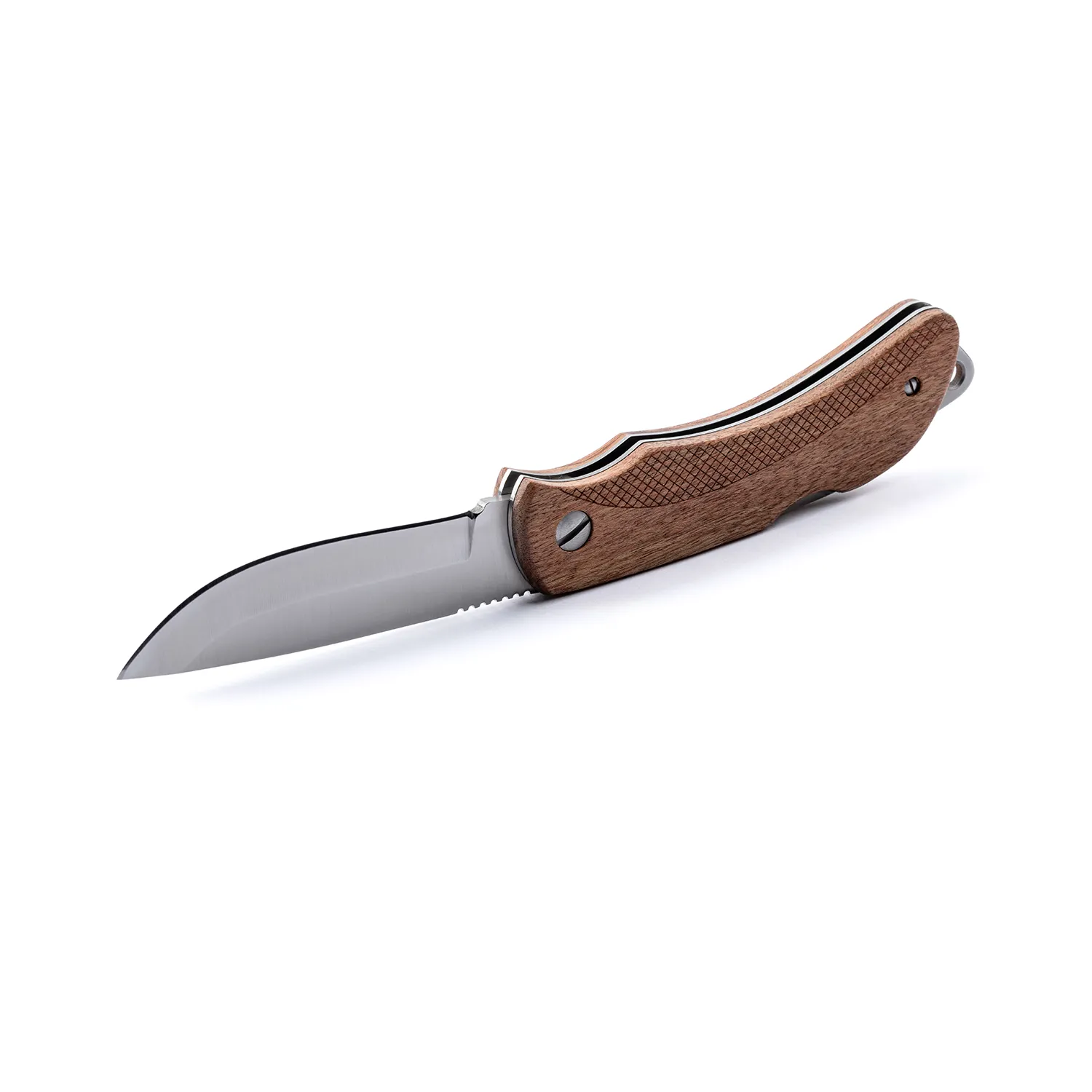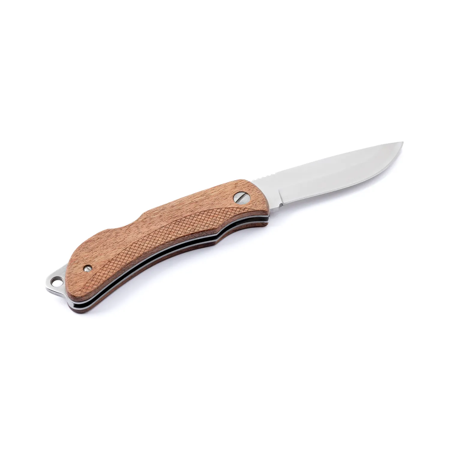 No matter your profession or hobby the folding knife Swede 8 Wood by EKA1882 will fill your needs. With its sturdy drop point blade and secure locking mechanism, the uses are endless. The handle material is made by elegant dark wood to release stressed conditions and to feel for the gentleman's touch. Included is a black leather sheath with a belt clip.