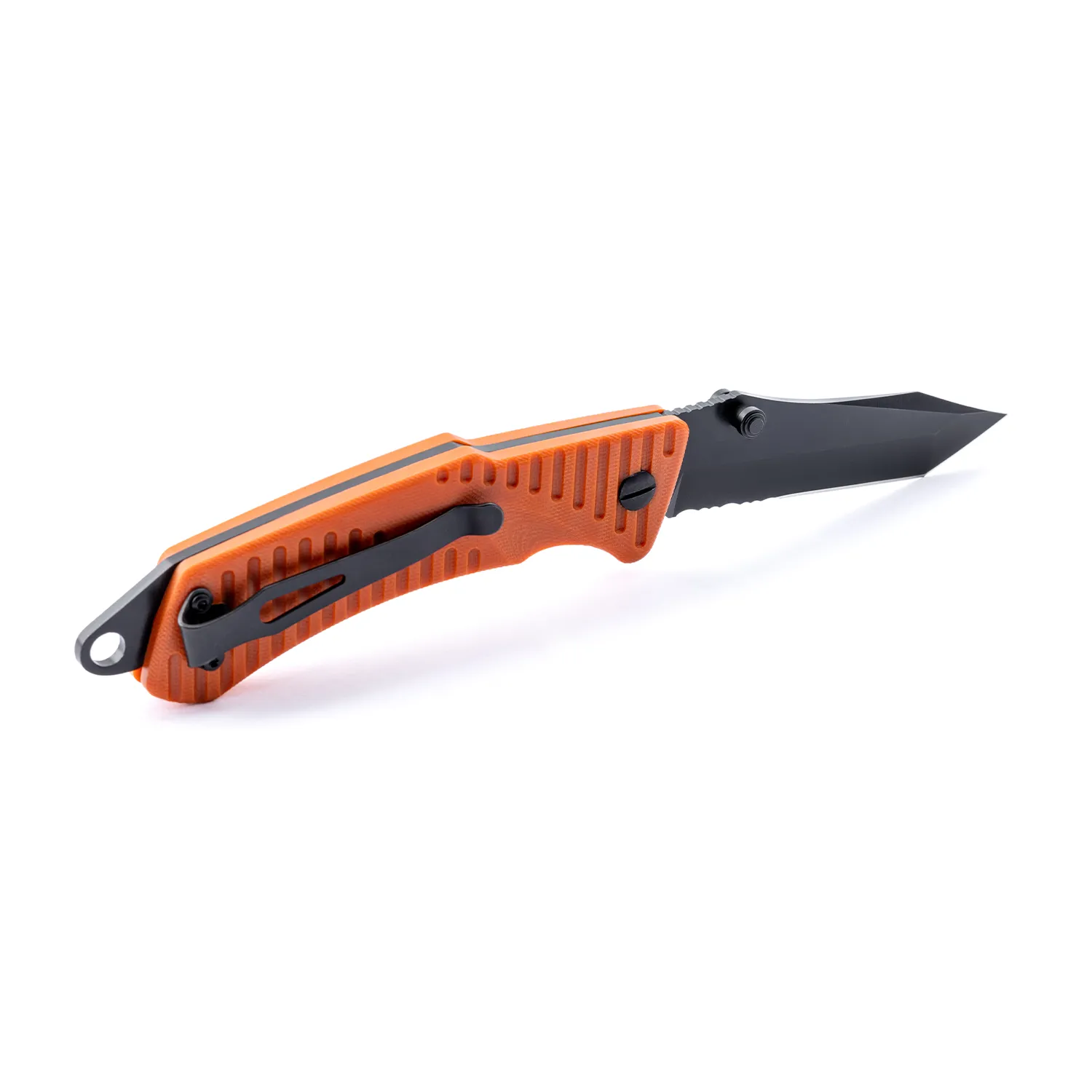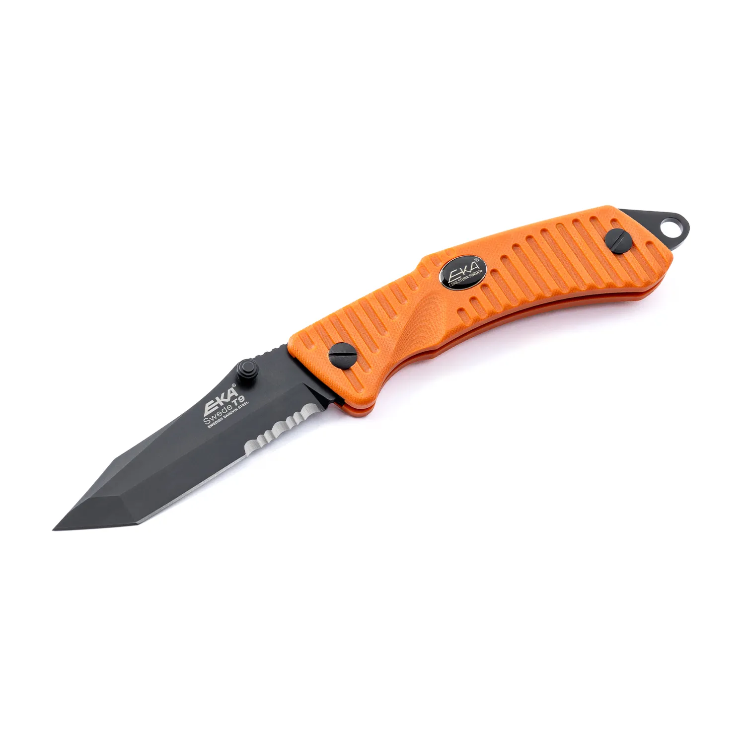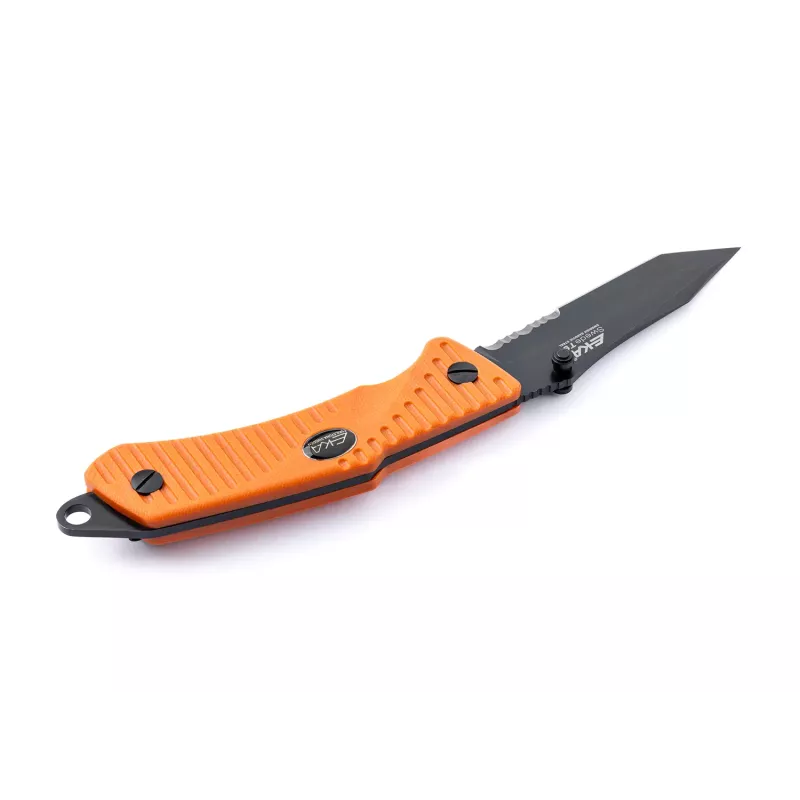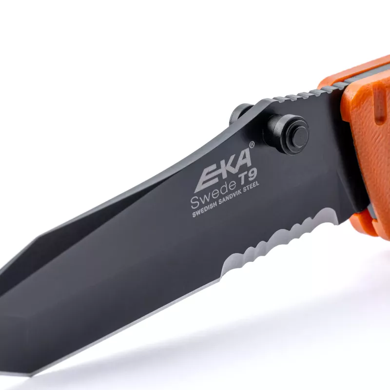 The Swede T9 Orange by EKA1882 is a heavy duty tactical folding knife with a unique Patented rear locking mechanism that creates a safe lock/unlocking motion with a confident grip. For Black coated pointed blade with a Tanto design suitable for an ultimate performance. Assembled with procession machine screws, allowing user to fine-tune blade action and complete disassembly for cleaning. The handle material is made by G10, offering 2 colors to choose from: orange and black. The Lanyard hole with a provided parachute cord is to avoid dropping your knife and a pocket clip is attached to keep it safe and where it should be.