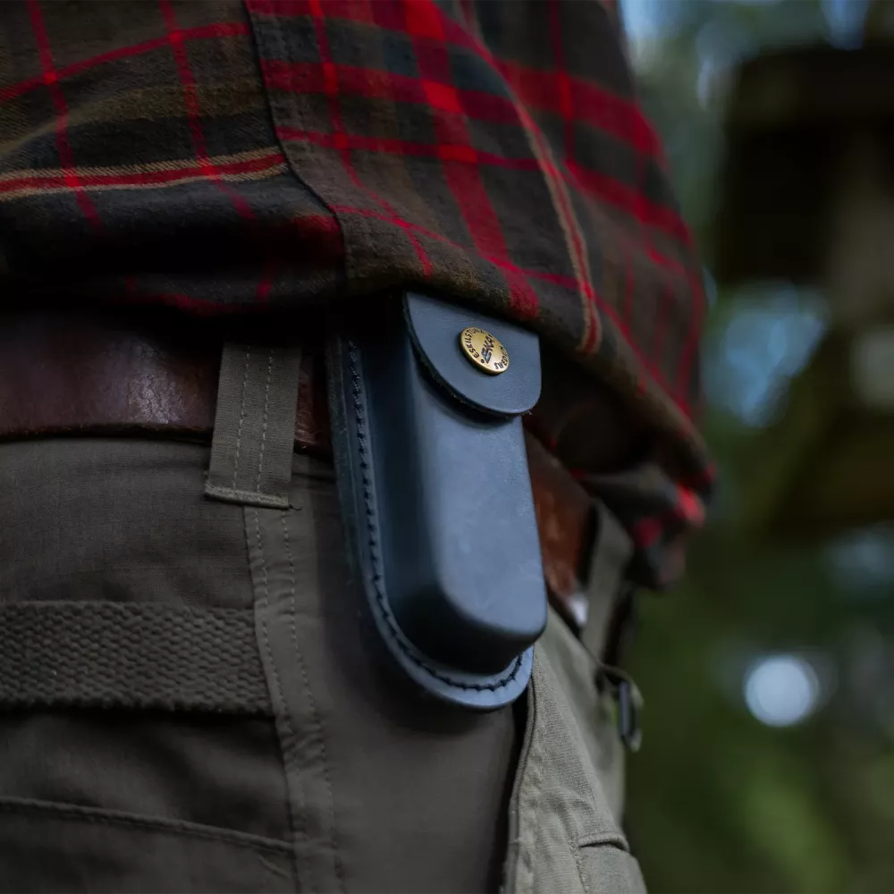 Knivfodralet 5" Leather Sheath Black, är ett stilfullt svart fodral avsett för fällknivar och speciellt framtaget för EKA1882’s modell Swede 10. Materialet i läder ger fodralet en exklusiv känsla och sitter på plats med en clip-on fäste på baksidan. Perfekt att kunna sätta på ditt bälte eller i en ficka. Snyggt och praktiskt!