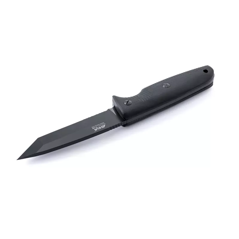 Nordic T12 Black från EKA1882 är designad för alla behov inom överlevnad, säkerhet, militär och räddning. Den kraftiga svartbelagda bladet med Tanto-design är 4 mm tjockt och har en full tang-konstruktion, vilket gör den perfekt för tung användning. Det texturerade tummgreppet på bladets baksida ger bättre kontroll. De ergonomiska handtagen i G10 är mönstrade för att säkerställa ett optimalt grepp under svåra förhållanden. Monterad med precisionsskruvar kan användaren enkelt plocka isär kniven för rengöring. Kniven är utrustad med en glasbrytare och ett lanyard-hål med en 550-fallskärmslina för att undvika att tappa den.