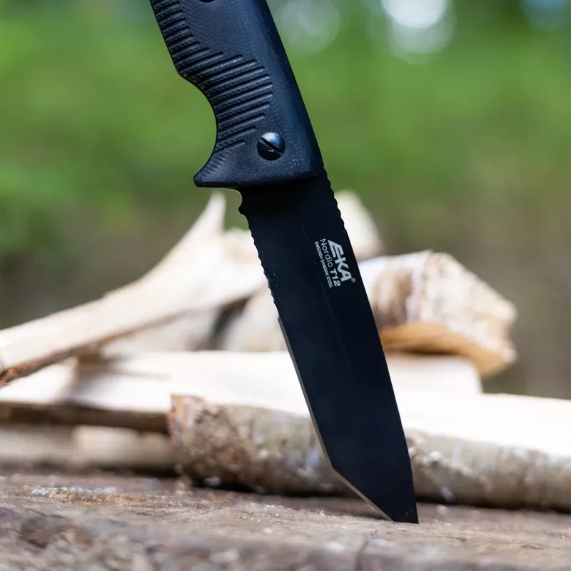 EKA Nordic T12 Black – kraftig kniv med svart Tanto-blad, full tånge-konstruktion, ergonomiska G10-handtag, glasbrytare och lanyard-hål för säkerhet.